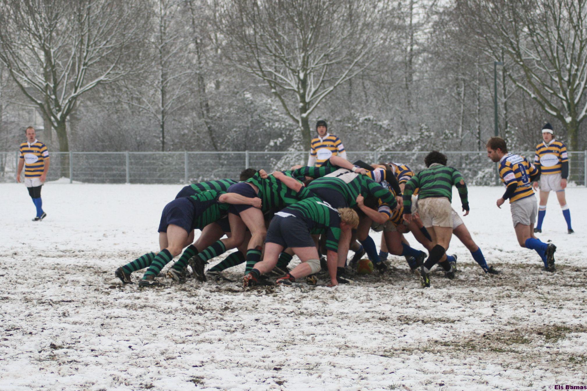 De sneeuw maakte het voor beide ploegen lastig om het spelritme te vinden en het duurde tot de 20e minuut voor de eerste try door de witte bodembedekking kon worden gedrukt. Het was Marcel Matse die met behulp van een complete groenblauwe sneeuwmachine het leder mocht drukken. Even later wisten ook Koen Maaijen en Roger van Dijk het trygebied te bereiken maar de conversions werden gemist (15-0). Den Haag gaf natuurlijk niet op en wist met een fraai uitgespeelde try tegen te scoren EN de conversion te benutten zodat het nog maar 15-7 was. Dat bracht weer hoop in de Haagse gelederen en op zo'n moment is het altijd erg belangrijk om deze direct weer de kop in te drukken. Roger van Dijk begreep dat, zag een gaatje in de hoek en scoorde met een fraai. (20-7).