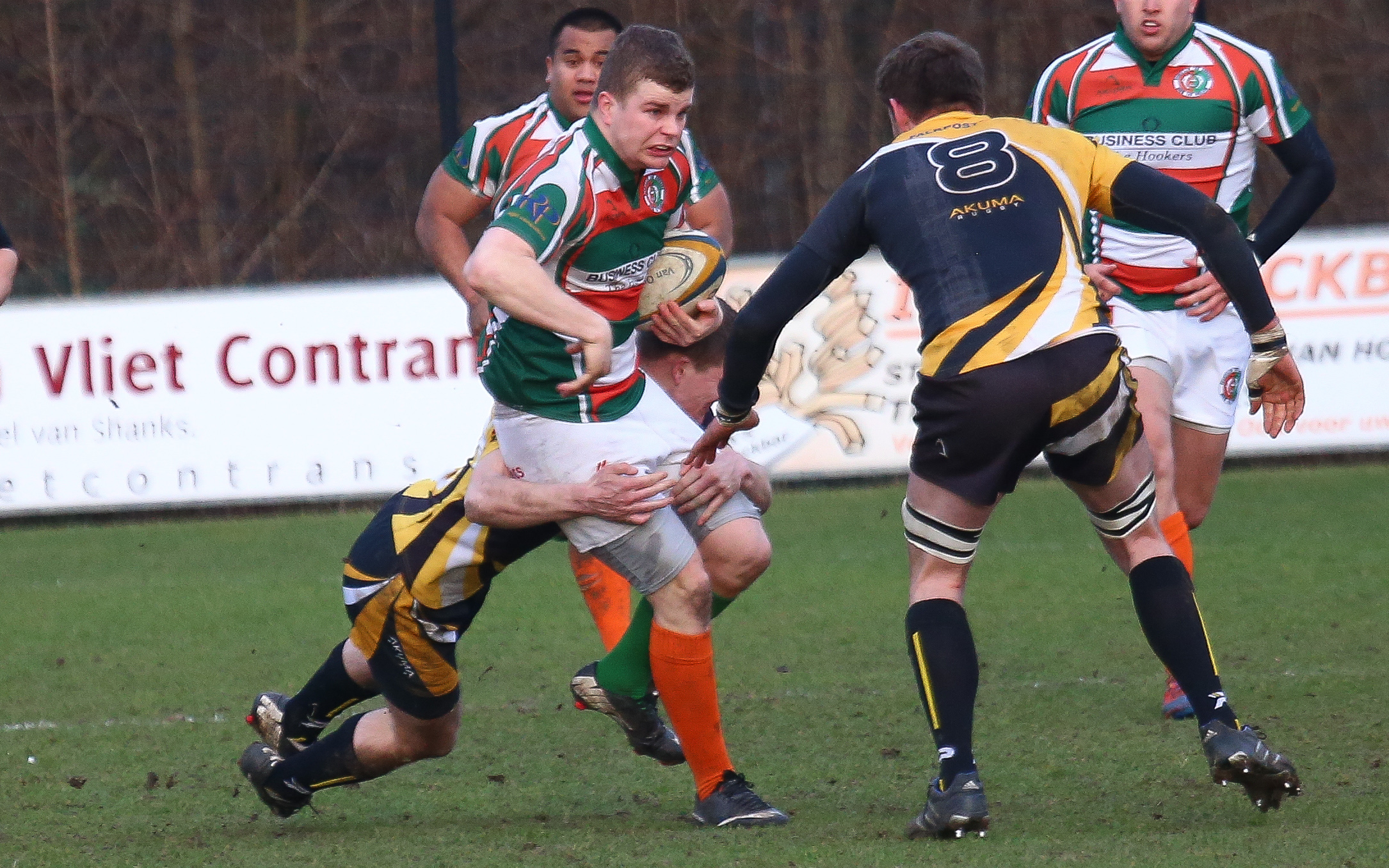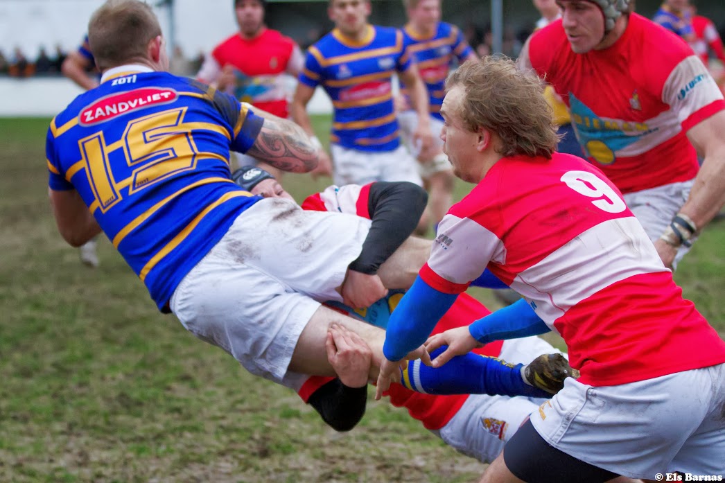 Twee studententeams lijken in de 1e klasse uit te gaan maken wie er kampioen wordt en promoveert richting Ereklasse.Door het beleid van de NRB zijn er geen playoffs meer, en is dus alleen de kampioen goed genoeg om zich volgend seizoen in de Ereklasse te vertonen.Met een riante voorsprong van 8 punten begon Ascrum aan de kraker tegen de nr 2 , DSR-C , met in het achterhoofd dat deze wedstrijd ook nog in omgekeerde volgorde dient te worden gespeeld dus er 10 punten te vergeven zijn onderling.Geleid door een zeer sterk fluitende Mike Hoyer ontspon zich in Delft een titanenstrijd die in de 1e klasse jaren niet was gezien.Twee aan elkaar gewaagde teams, beide met een degelijk pack, maar vooral levensgevaarlijke backline, en beide teams die het meer van het rugby dan van het kicken moeten en willen, hebben. Ondanks een miezer regen ging het spel op en neer, en was na een prachtige aanval David van Horn die de score voor Delft kon openen, let wel, dit na een 0-0 ruststand, dus pas in de tweede helft, ook een unicum in dit soort wedstrijden, zo dicht lagen de teams bij elkaar.Er werd gestreden voor elke meter, en niet veel later , was het de zeer luidruchtige winger van Ascrum, die na het veelvuldig uitschelden en bekritiseren van zijn eigen team, toch in de hoek mocht scoren, na een prima aanval door de Amsterdamse voorwaartsen.Ascrum nam zelfs een 10-5 voorsprong en leek af te stevenen op een vroeg kampioensfeestje totdat Joe Stout aan Delftse kant de vechtlust beloonde met een try in de hoek. Wederom werd de conversie gemist, en was de stand op 10-10 weer in balans.Een gemiste penalty van Delft resulteerde even later in een counter, en kans voor Ascrum, die gelukkig voor de mannen van de TU eindigde in een knock on , waardoor de lange weg terug naar de overkant van het veld, tegen de wind , weer kon worden ingezet.De druk van Delft werd groter, en 3 minuten voor tijd was het Karel Goense, die na een prachtig crosskickje van Oscar Binnenveld, de bal uit de lucht plukte, en de fullback versloeg, om wederom in de hoek, de stand op 15-10 te brengen.Ascrum toonde zich kampioenswaardig, rechtte nog 1 keer de ruggen, en kwam tot op de 22 meter lijn van delft, waar een turnover het einde van de Amsterdamse comeback betekende en Delft, met het verlies in de laatste seconde tegen HRC in het achterhoofd, de wedstrijd professioneel uitspeelde.De winst voor Delft houdt de 1e klasse in elk geval nog een aantal weken spannend.De return in Amsterdam is op 23 februari,maar beide teams moeten elke wedstrijd op hun hoede zijn want extra verliespunten zou zomaar het einde van de kampioensaspiraties van beide teams kunnen betekenen.Een heerlijke rugbymiddag in Delft, met een zinderend eind, deed de talrijke toeschouwers in elk geval uitkijken naar het laatste deel van het tweeluik, op het kunstgras in Amsterdam.