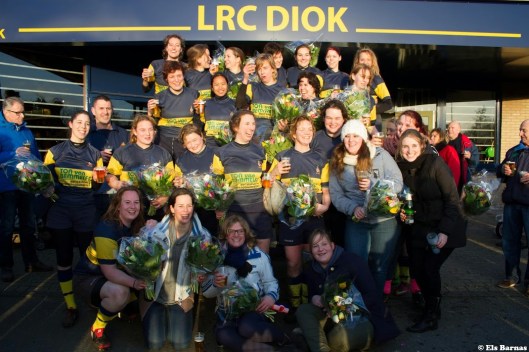 Het damesteam van Leidse rugbyclub DIOK is vandaag voor eigen publiek kampioen geworden van de Eerste Klasse door hun directe concurrent WAD met 41-7 te verslaan. Met deze titel op zak verdienen de dames promotie naar de Ereklasse, het allerhoogste niveau in Nederland. Na het laatste fluitsignaal waren de dames uitzinnig van vreugde en vierden zij hun kampioenschap met coach Paul Morris tot in de kleine uurtjes.