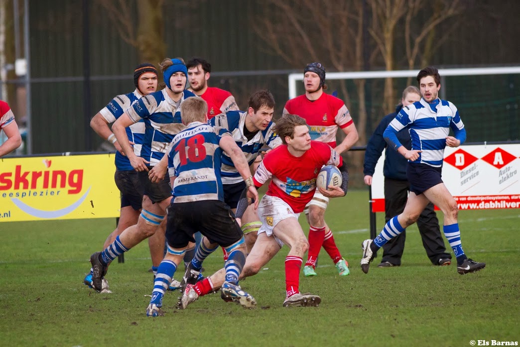 De rugbyvelden in Nederland hebben het zwaar. De vorst en sneeuw blijft uit, hoge temperaturen en dus regen, heel veel regen. Ook het veld in Castricum kreunt onder deze weerscondities, maar doorstaat tot nu toe de test. De Castricumse Rugby Club had een goed gevoel overgehouden aan de wedstrijd tegen Den Haag vorige week en wilde deze lijn doorzetten. Goed verdedigen, vechten om elke centimeter groen en vlijmscherpe aanvallen. Natuurlijk speelt de tegenstander van vandaag, Hilversum een ander spel dan Den Haag, maar geloof in eigen kunnen is een goede basis. Er ontspon zich een aantrekkelijk kat en muis spel op het hoofdveld van de Duinranders. Na een kleine 10 minuten werd de openingsscore, na een eerder gemiste penalty kick van Fedde Lingsma, door Rik Roovers verzorgd met de conversie voor Lingsma. De thuisploeg wilde koste wat kost de aansluiting houden en via Ioan Tomsacu werd deze inspanning beloont. Menno Rechsteiner was minder gelukkig in de afronding van de bonus. Dit smaakte absoluut naar meer en brutaal werd de voorsprong, door een try van Sepp Kotten, gepakt voor Castricummers. De gasten lieten dit niet op zich zitten en via Jeroen Alma en Lingsma werd de achterstand omgebogen in een 10 – 14 voorsprong. Nog voor de rust stelde Cas RC orde op zaken door een try van Rob van der Velden en de twee extra punten door Rechsteiner. Met de stand 17 – 14 werd de rust ingeluid. De tweede helft werd het hele veld benut voor vooral scrums, line-outs en penalty kicks. Het windvoordeel was voor Hilversum en daar maakte Storm Carroll veel gebruik van. Hier werd het nodige terreinwinst mee geboekt, echter beide teams stonden verdedigend zeer sterk te spelen, dus er was geen doorkomen aan. Waar verdedigd wordt, worden fouten gemaakt en dat was vandaag niet anders. De Castricummers gaven twee scorings mogelijkheden via penalties weg, waarvan Lingsma er 1 benutt. Hiermee was de stand weer gelijk en lang leek het op een gelijkspel uit te draaien. Ook Hilversum trok zo af en toe aan de noodrem en Rechsteiner maakte dankbaar gebruik van de gegeven penalty door deze beheerst tussen de palen te schieten. De druk werd opgevoerd en Cas kwam met de schrik vrij na twee weggegeven scrums voor RCH op de 10 en 5 meter van het try gebied. De ontlading was dan ook groot na het laatste fluitsignaal van Michael Stevenson. Eindelijk was het kwartje de Castricumse kant uitgerold, met dank aan het meelevende publiek dat vandaag als zestiende man diende.