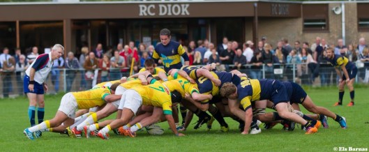 De kraker tussen het Leidse DIOK en het Haagse HRC staat altijd garant voor spektakel. Het publiek ging er zaterdag onder een stralend herfstzonnetje dan ook eens goed voor zitten. Veel te genieten viel er voor het Leidse thuispubliek niet, want na een dramatisch verlopen eerste helft stond DIOK al met 0-24 achter. In de tweede helft vocht DIOK zich met twee try’s nog wel terug in de wedstrijd, maar omdat ook de Hagenezen nog eenmaal wisten te scoren, was dat niet voldoende om HRC te verslaan.