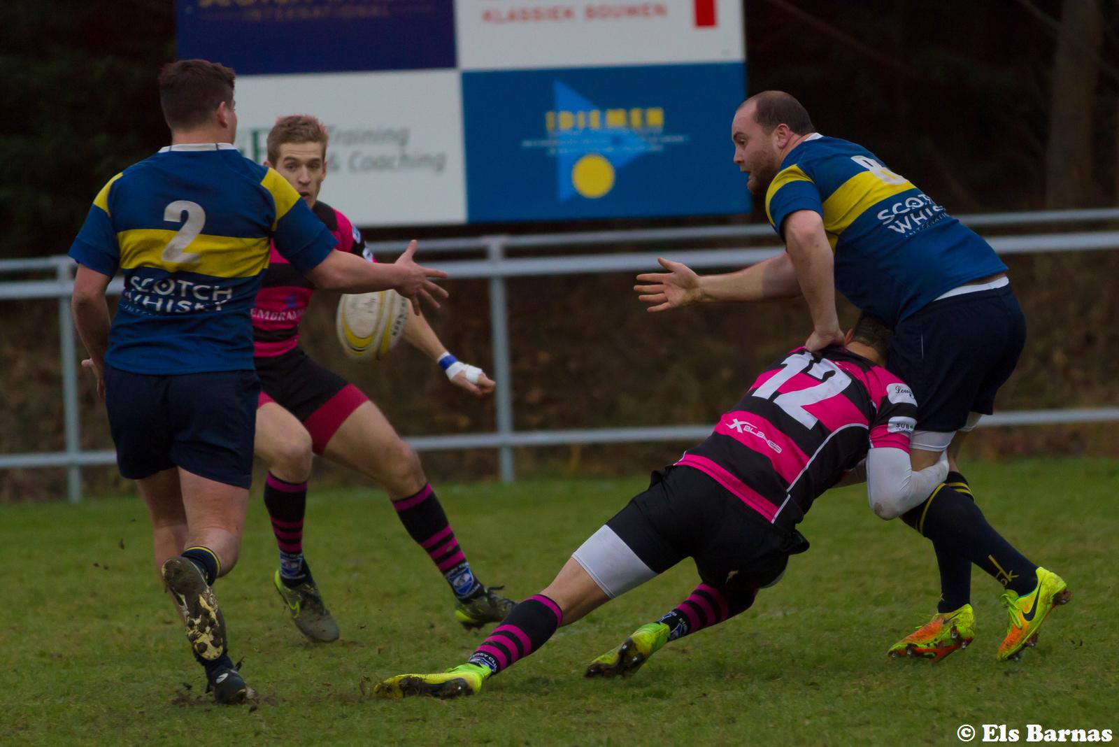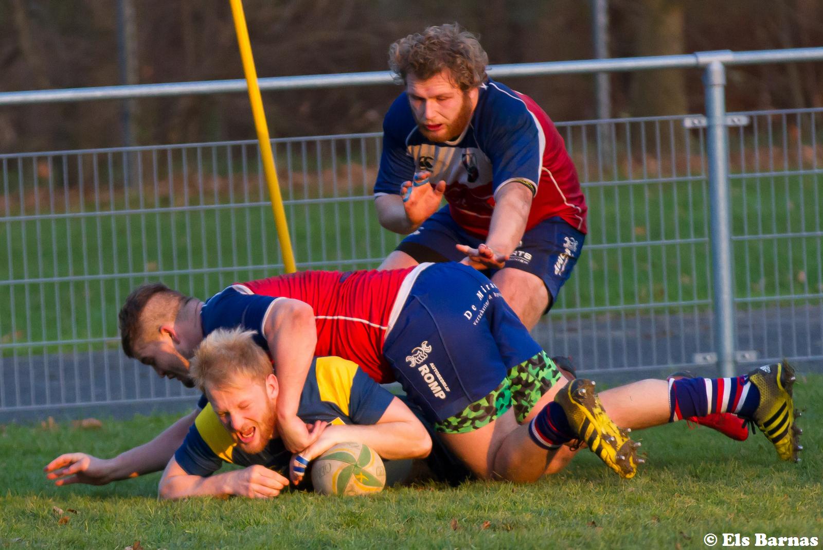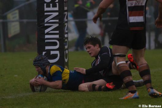 Halverwege de eerste helft kwam DIOK vanuit een fantastisch uitgevoerde line-out op de 22m van Hilversum dan toch dichterbij. Daar waar Hilversum verwachtte dat de bal naar een springer zou gaan, ging de bal naar de op snelheid inlopende Ruben Niggebrugge. Vanuit zijn offload kon captain Ross Bennie Coulson scoren. Wing Kyle Barr schoot daar heel keurig nog 2 punten bij en zo kwam DIOK terug tot 7-10. Hilversum deed echter meteen iets terug en met twee try’s in korte tijd liepen zij uit tot 7-22 bij rust. Toch had het weinig gescheeld of de marge was kleiner geweest, want DIOK kwam nog een aantal keer dicht bij een try vanuit een serie penalty’s kort voor de tryline.