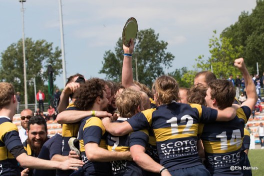Try’s scoren in finales als de druk het hoogst is, dat blijft altijd lastig. ‘Keep the scoreboard ticking’ was dan ook het devies voor DIOK en dankzij drie rake penalty’s van Leon Koenen wist DIOK al snel 9 punten van de achterstand af te snoepen: 15-20. Het geloof kwam weer terug in de ploeg en de druk op de Dukes werd verder opgevoerd. Een kwartier voor tijd was daar dan eindelijk de verlossende try. Een backhand offload van Richard Manley landde in de handen van fly-half Mees van Oord die een gaatje spotte en over de tryline dook! Uitgerekend de jongste DIOK-speler op het veld – die maandag nota bene nog eindexamen moet doen – brak de ban voor DIOK en bracht de stand op 20-20. Leon Koenen stapte naar voren voor de conversie en ook deze ging raak: 22-20.