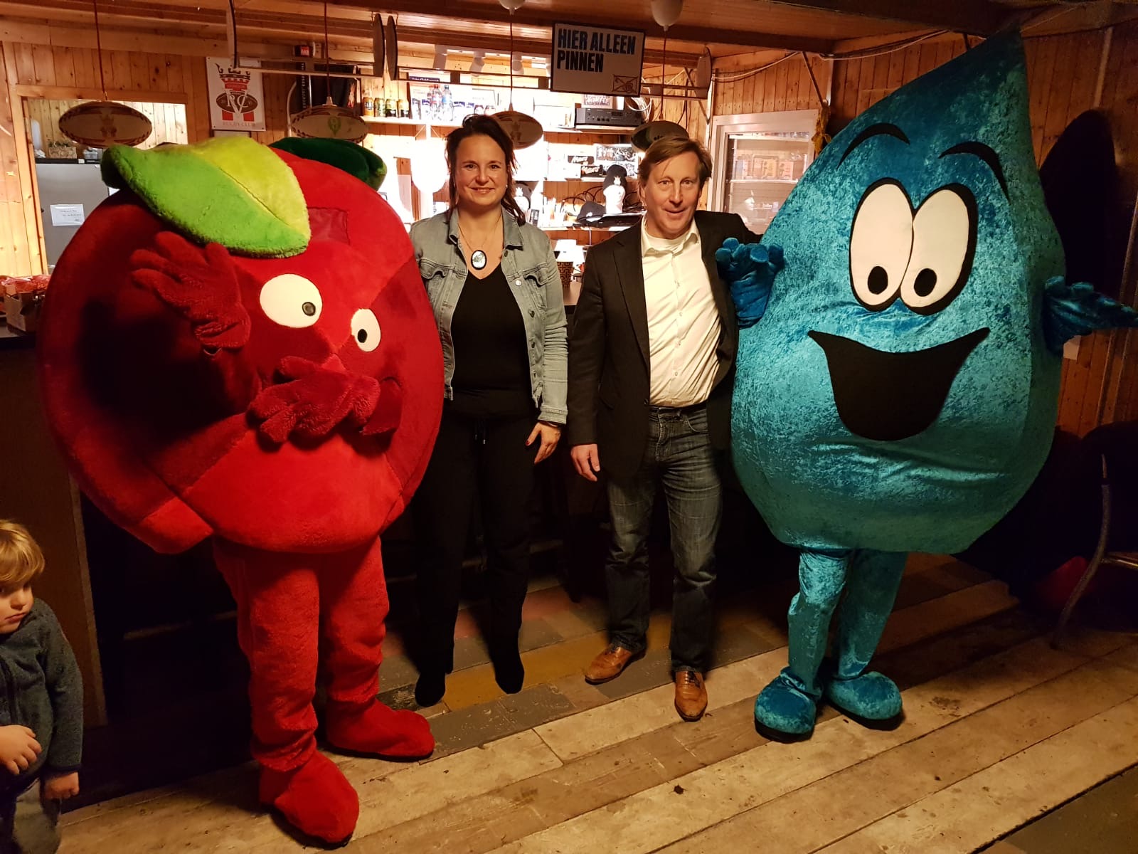Op de uitreikingsfoto: V.l.n.r Mascotte Tomaat, Bianca Put – Van der Voorn (VRC), Nadine Stemerdink (wethouder), Mascotte Druppie en Peter Kolthof (VRC). (fotocredits Miriam Blom, SenW)